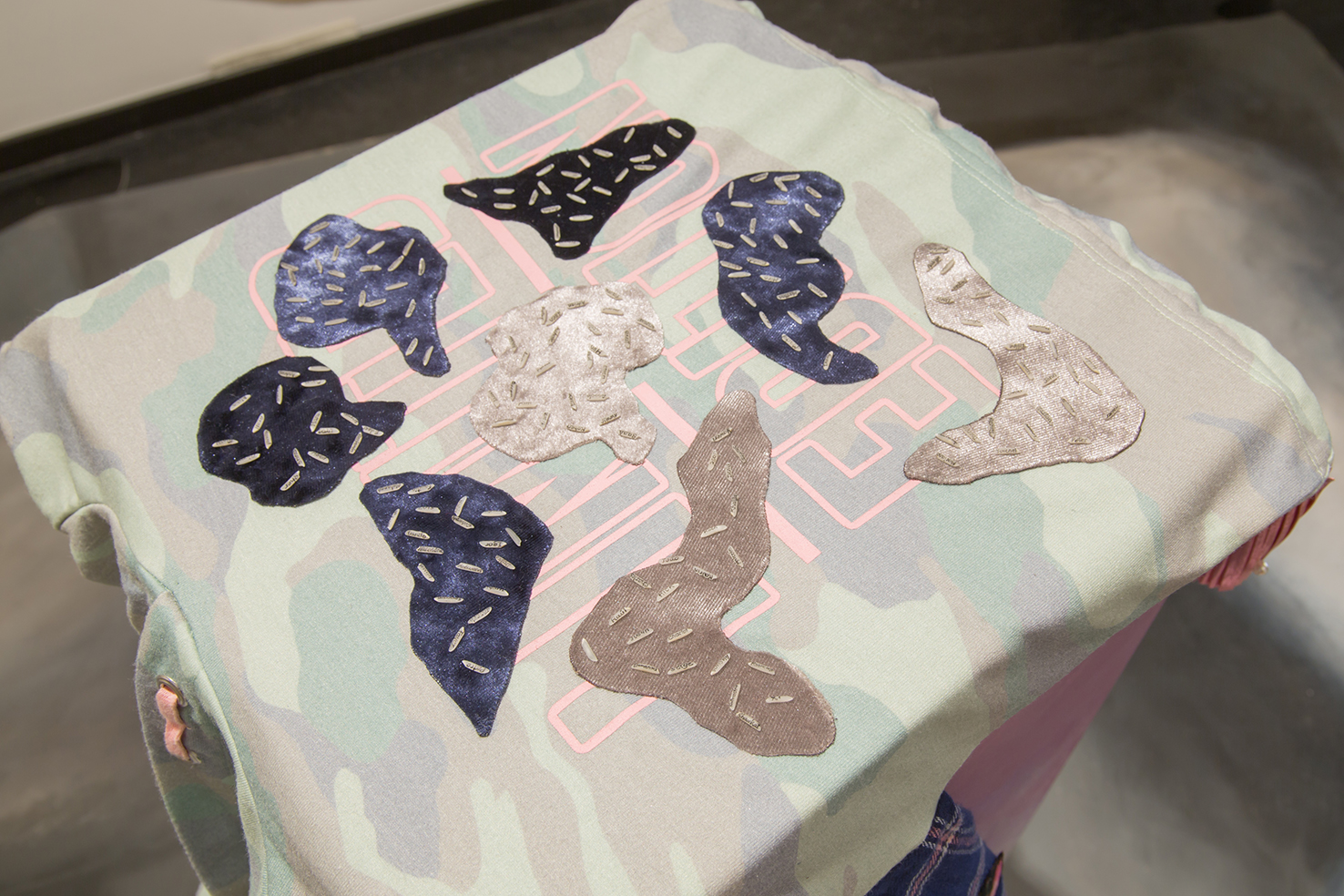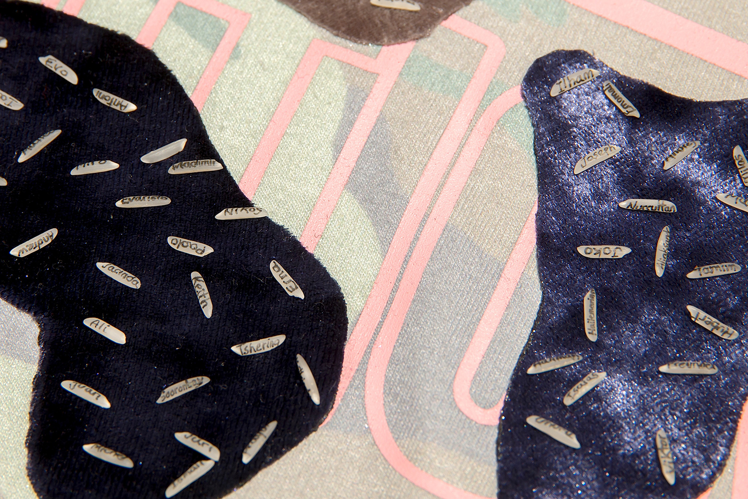 Presidents, the first piece of a long-term project, is a central element in the installation. The name of every current head of state in the world is written on a rice grain and placed on a girl’s garment. Each garment consists of a collage of fashion trends observed during the piece’s production year (during 2017, in the case of the mentioned edition). I am committed to produce a new piece for this series under the same principles every 4/5 years (according to an average presidential period) over the entire course of my life. On the walls, leather numbers form the year 2059, in which, according to current life expectancy, my death would take place.